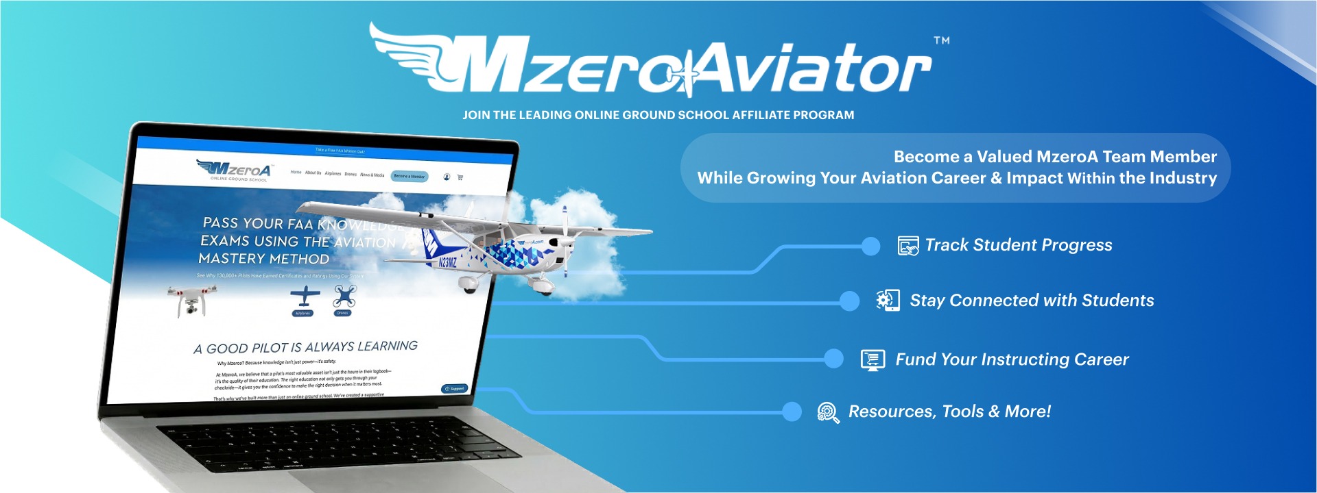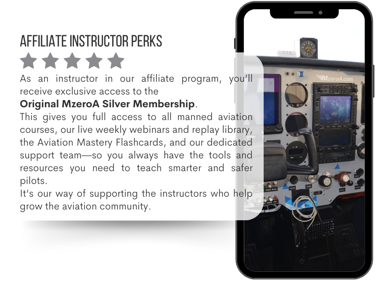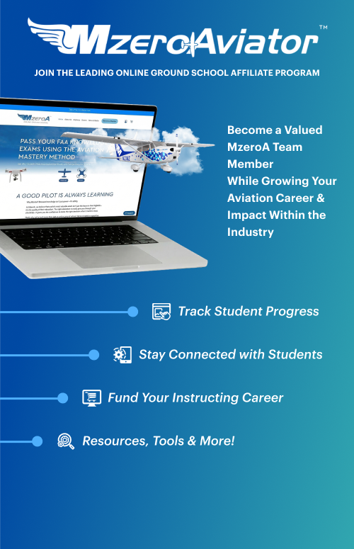 MzeroA Online Ground School is recognized as the leading provider in online aviation ground school, trusted by thousands of student pilots all over the country. As an instructor or advocate, you are the fuel of the aviation industry, and we believe in your success. By becoming an MzeroAviator, you are not just joining an affiliate program; you are becoming an official team member of the MzeroA Nation, while creating your own ‘learn to fly’ ecosystem or institution of pilot training. This affiliation is designed to equip you with superior teaching tools and connect you directly with a nationwide student base ready to fly.